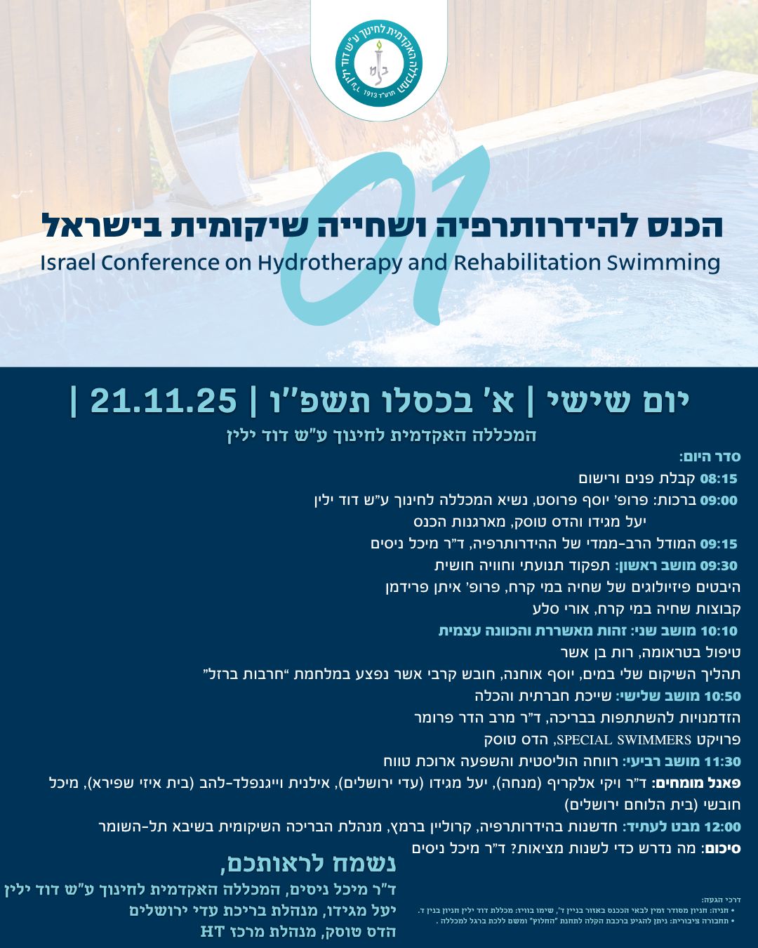 אנחנו שמחים להזמין אותך לכנס להידרותרפיה ושחייה שיקומית בישראל, שיתקיים ב־21.11.25 במכללת דוד ילין בירושלים.