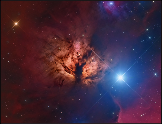 הכוכב הבהיר מימין הוא Alnitac שמהווה חלק מחגורתו של אוריון. כוכב זה הוא כוכב אנרגטי ביותר. הוא מאיר את ענני הגז סביבו, ויוצר את דמות הלהבה הבהירה. ענני האבק האפל בסביבת הערפילית יוצרים את הפסים הכהים על פני הלהבה.